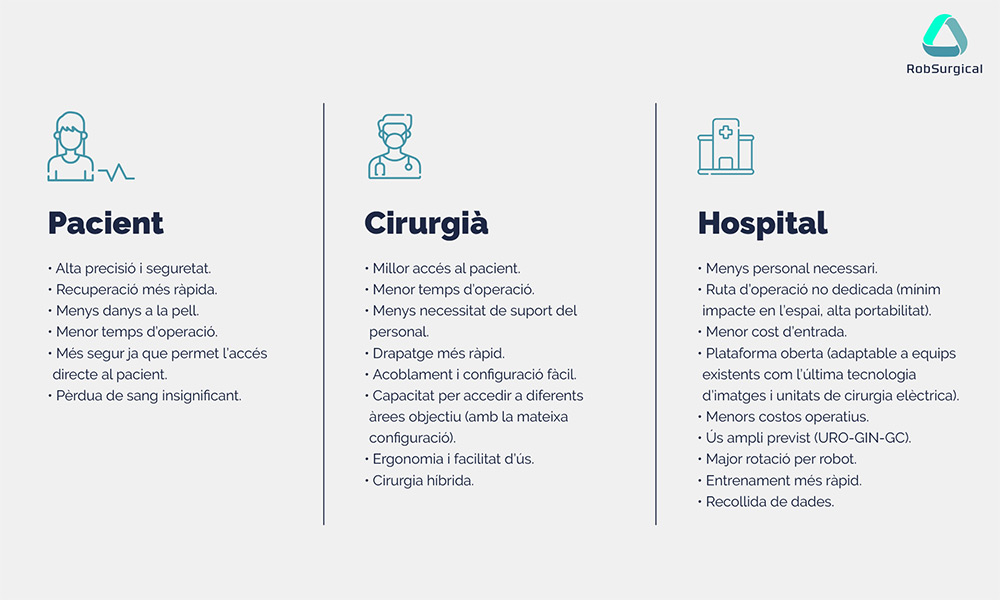 Els avantatges que proporciona el robot de Rob Surgical es desglossen a partir de tres conceptes bàsics: els 4 braços robòtics, el sistema on-demand i la plataforma oberta i portable.